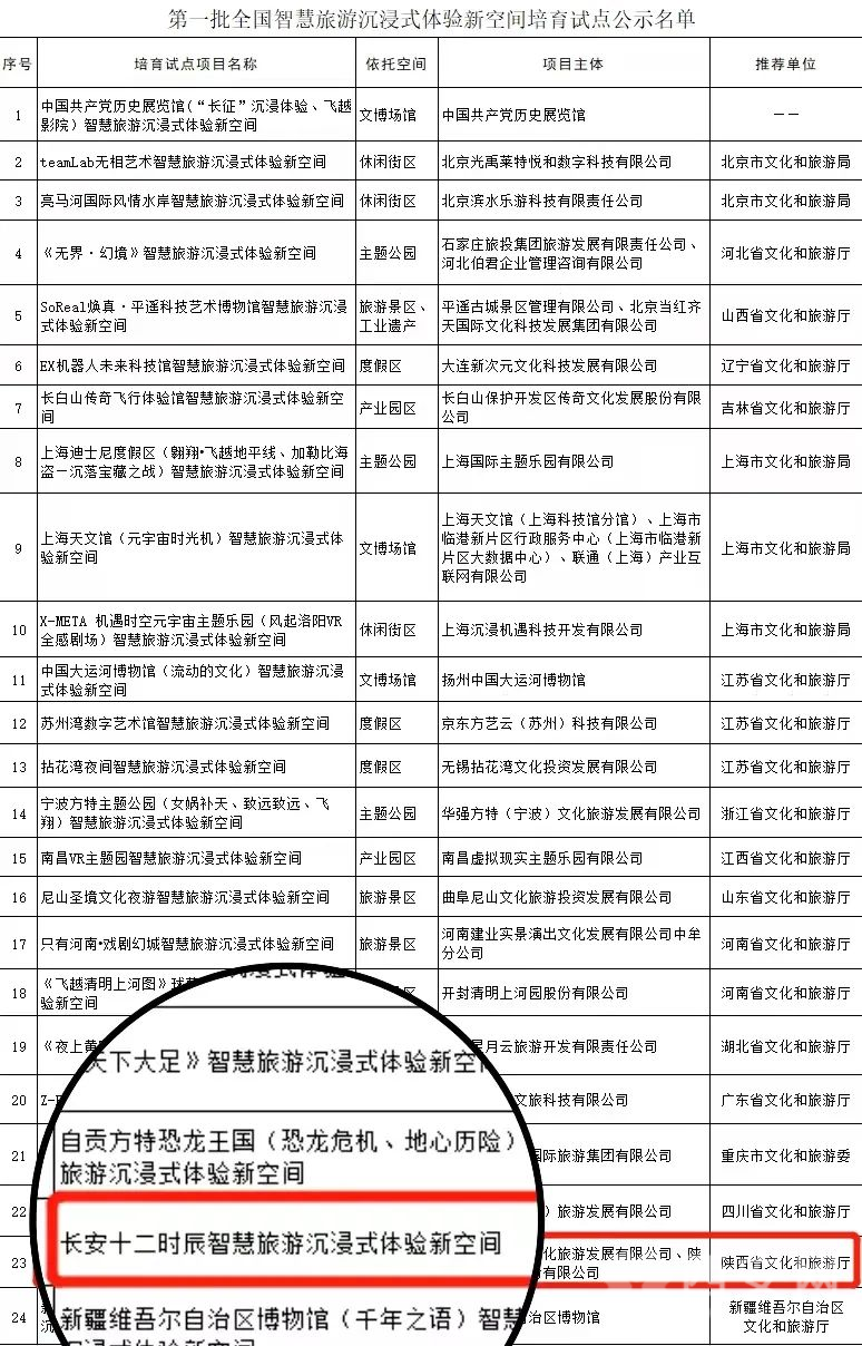 西安网讯(记者 黄敏 实习记者 张资凡)8月3日,文化和旅游部确定第一批全国智慧旅游沉浸式体验新空间培育试点名单,共24个项目上榜,我市长安十二时辰主题街区成功入选首批培育试点名单,同时也是陕西省唯一入选项目!