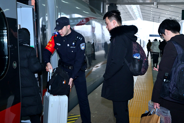 “各位旅客您好,欢迎乘坐首趟延京高铁G359次列车,我是本次列车乘警,提醒大家看管好随身行李,切勿将危险品带入车厢……”列车启动后,乘警手持扩音器,逐节车厢开展安全宣传。他们用通俗易懂的语言,向旅客讲解高铁乘车安全须知、防盗窃、防诈骗、应急避险等知识,重点提醒老年旅客、携带儿童的旅客注意出行安全,同时耐心解答旅客关于乘车秩序、物品保管等方面的疑问,引导旅客文明乘车、安全出行。