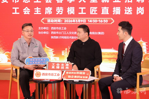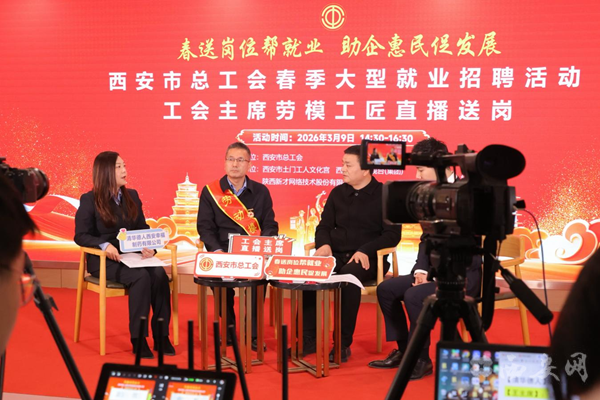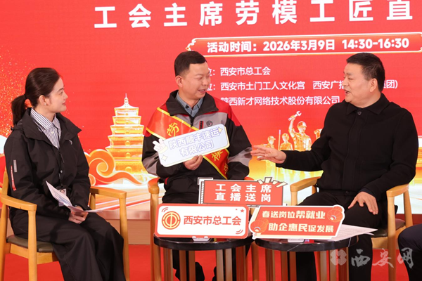 3月9日,西安市总工会“春风送岗帮就业,助企惠民促发展”2026年春季大型就业招聘活动暨工会主席直播送岗在西安市土门文化宫成功举办。西安市总工会常务副主席王雷化身“主播”,进行第一场直播送岗,260余家企业参加现场招聘会,同步上线西安市总工会就业服务云平台,网络视频招聘会参会企业1004家,全市工会“春风行动”就业服务活动全面启动。